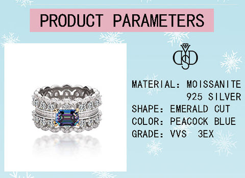 【#134 YSDD】1CT Peacock Blue Emerald Cut 925 Sterling Silver Moissanite Rings
